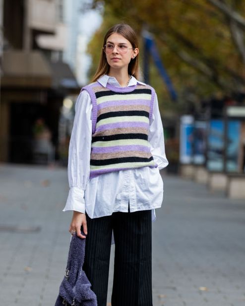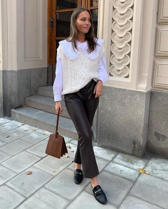 No es ningún secreto que los chalecos de punto están causando furor este otoño-invierno. En los últimos meses su popularidad se ha disparado gracias a los estilismos que logra conformar esta prenda. Si quieres llevar un estilo ‘preppy’ te aconsejo que escojas un chaleco con cuello de bebé y lo combines con una camisa debajo como en esta foto. Acertarás seguro.